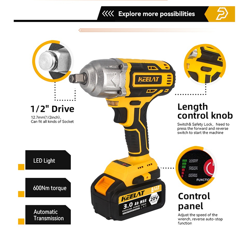 基拉特KID006 600N。M电动冲击扳手无绳大扭矩1/2“1/4”螺丝刀钻重型专业无绳冲击扳手插座电动工具可充电20V电池