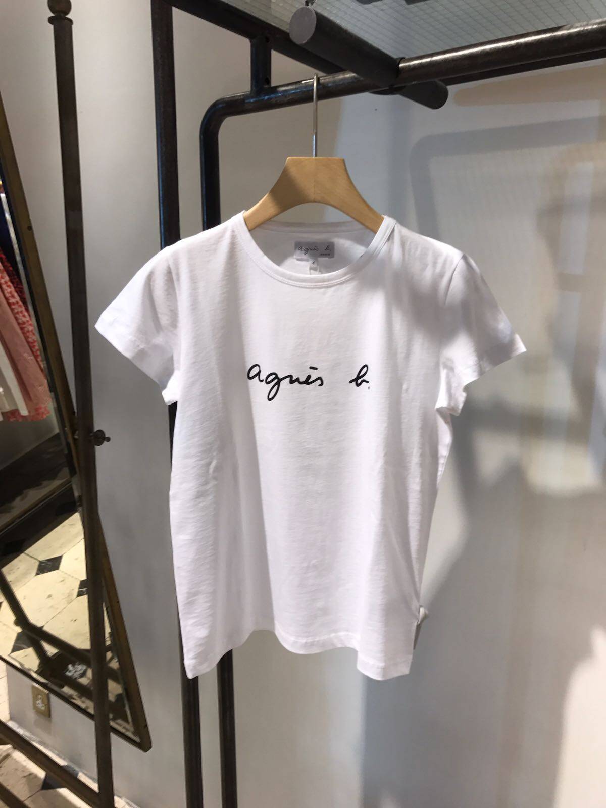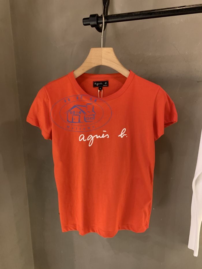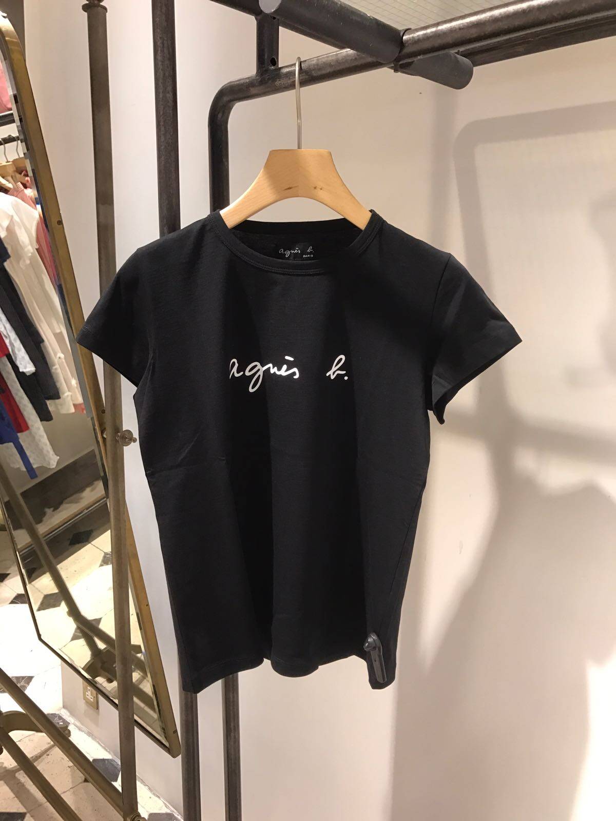 春夏季新款agnes b草书PALEESIJA字母纯棉短袖T恤深蓝色女装